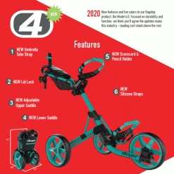The Clicgear 4.0 is an update on the very successful 3.5 model. Whilst maintaining the core structural and design features that made the 3.5 model so popular, the 4.0 has had several design improvements . These include, increased cargo net storage by 80% for even more room. Added a new Easy-Clip Bag Strap System that makes it easier to adjust and fit your bag on the cart, no matter the size or type of bag. Improved the umbrella storage clip to prevent any lost Umbrella Tubes. Clicgear have also redesigned the Brake System from top to bottom with a new cable anchor pivot assembly that eliminates cable wear and damage. The brake gear and hammer profiles have also been improved to engage better and reduce stress on the cable. Last but not least Cligear have improved the cup holder with the introduction of the Cup Holder Plus which is a more adjustable and lighter cup mount.
