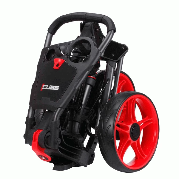 The New & Improved Skymax Cube 3 Golf Trolley is the smallest folding 3 wheeled golf trolley on the market Measuring in at an impressive folded 44cm x 37cm x 49 cm, It’s also one of the lightest on the market at just 6.6KG. Packed with features such as an oversized handle with built in storage compartment and drinks holder the Cube 3 also features a handy foot brake so that you can secure it on hilly terrains. The patented one click folding mechanism also makes the Cube 3 golf trolley one of the quickest and easiest golf trolleys to fold and unfold during use.