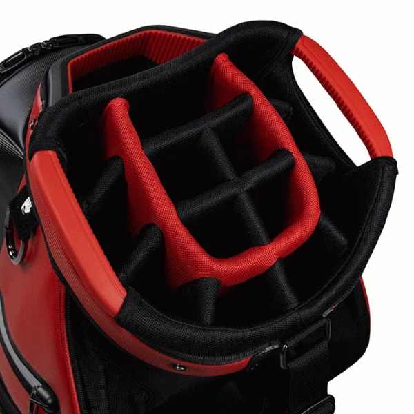 The New & Improved Taylormade deluxe golf cart trolley bag is constructed from a premium PU leather material that offers a superior quality tour look and finish. The 14-way divider top with 3 full-length dividers offers maximum space for club organisation. A key lock base keeps your bag and clubs securely on trolleys for maximum protection, with forward facing pockets offering easy access. The bag features 8 forward facing storage pockets Including 2 garment pockets, Rangefinder pocket, Accessory pocket, Ball pocket, Tee pocket, Cooler pocket and a Velour lined valuables pocket